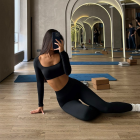 El crop top estiliza la cintura y realza el torso, mientras el legging de tiro alto moldea sin apretar, creando una silueta limpia, femenina y fuerte.